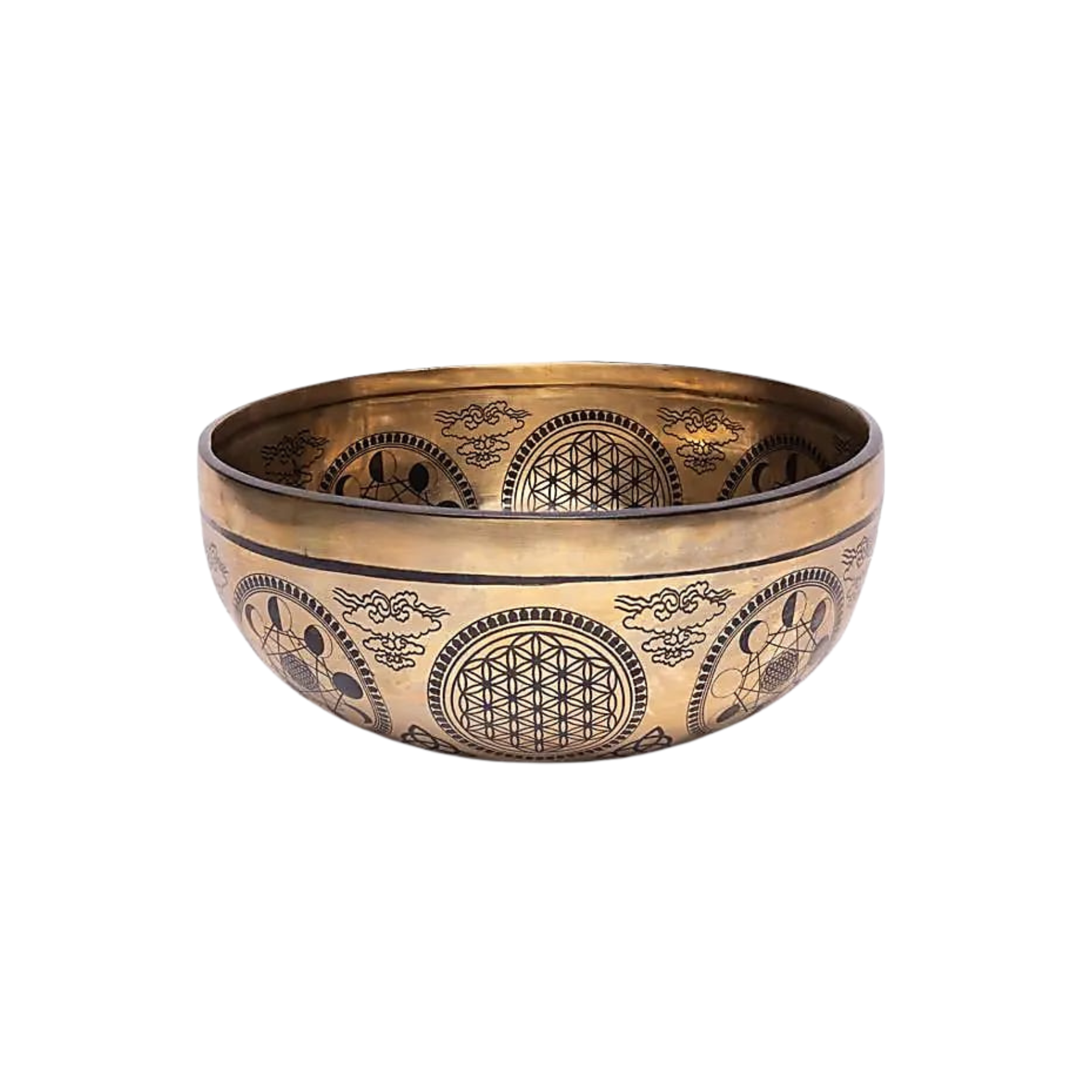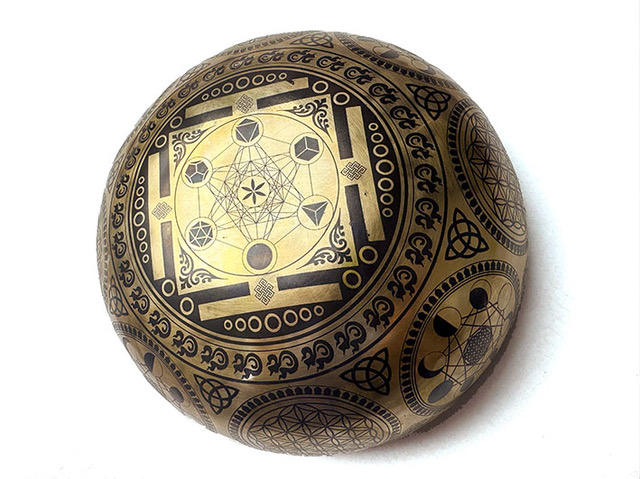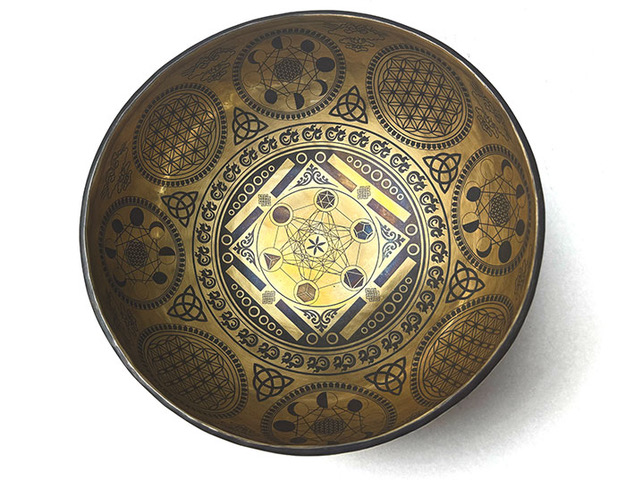 Géométrie sacrée et clarté structuranteCe bol réunit la Fleur de Vie, le Cube de Métatron, les solides de Platon et les cycles lunaires. Une véritable cartographie du vivant : la matrice, l’architecture et le mouvement réunis dans un même espace sonore.