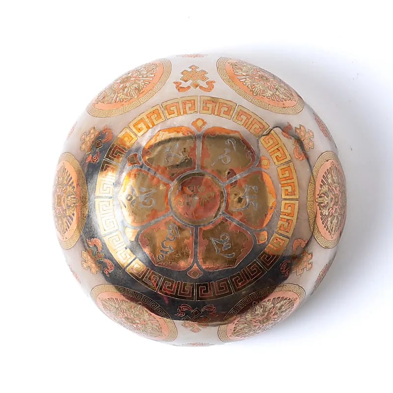 Le bol est en outre décoré de symboles de bon augure tels que le double dorje, le lotus et le nœud sans fin, ainsi que le mantra de compassion « Om Mani Pad Me Hum ». Le placage argent est appliqué selon un processus électrochimique minutieux, enveloppant chaque bol d’une couche brillante d’argent pur qui enrichit son ton et ses vibrations.