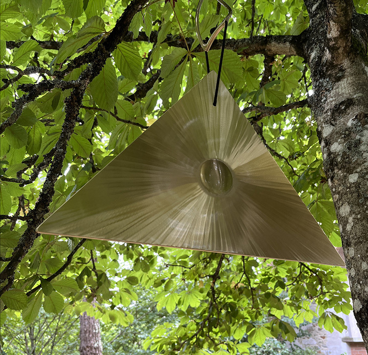 Gong plaque ou 'Russian bell' à suspendre de chez svaramMagnifique gong plaque triangulaire en laiton épais tout droit sorti de l’atelier SVARAM.
