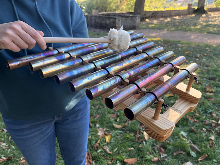 Ce magnifique instrument est l’œuvre de deux luthiers inspirés Séverine et Chris. Mandalia a accompagné la création de ce joli tubalophone 8 tubes portatif dédié aux éléments.